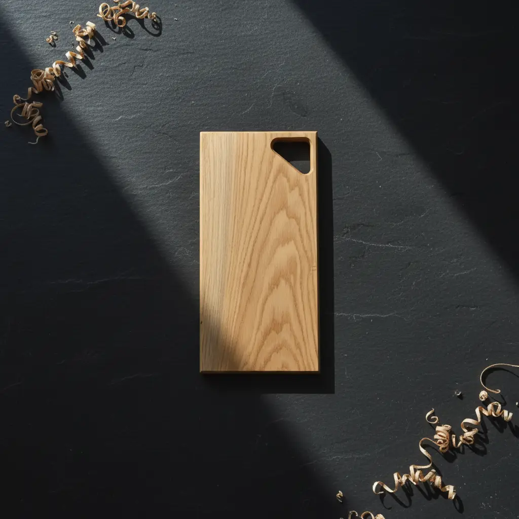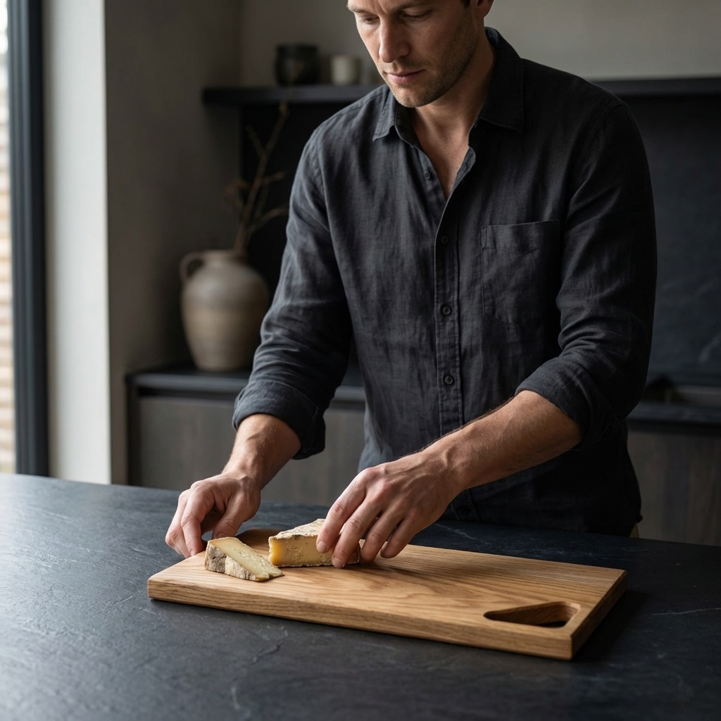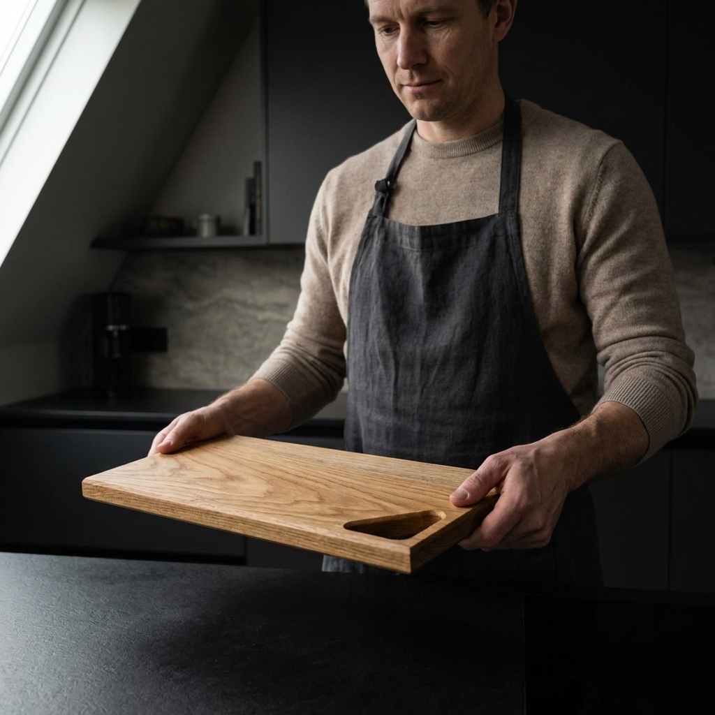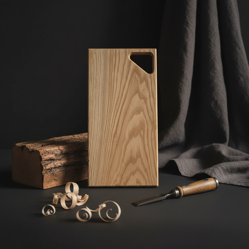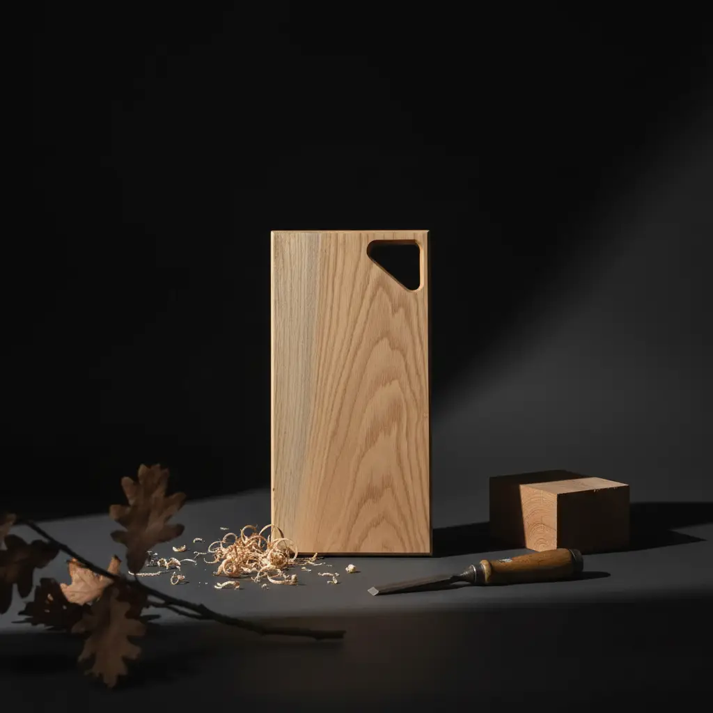 We werken met zorgvuldig geselecteerd eiken. De afwerking is voedselveilig en verdiept de nerf zonder overmatige glans. Randen en hoeken zijn subtiel afgewerkt voor een fijne grip.