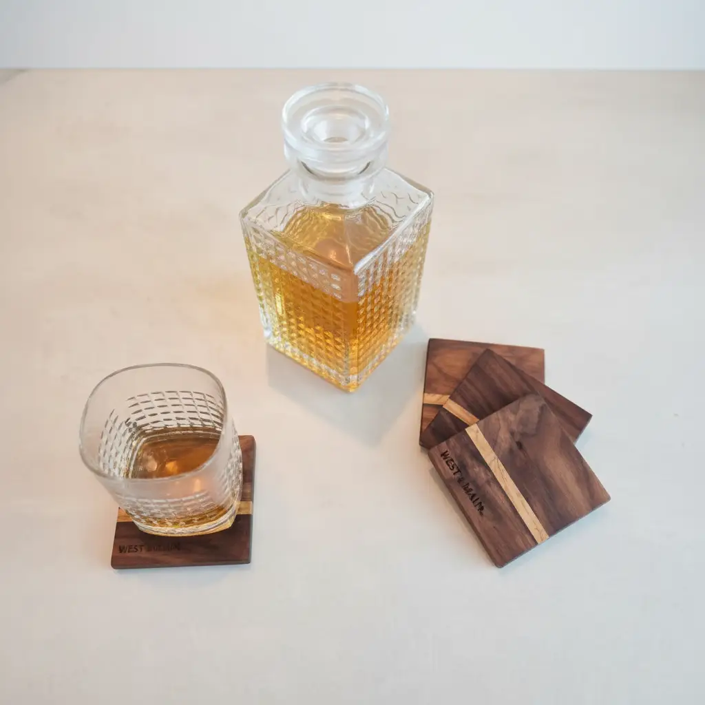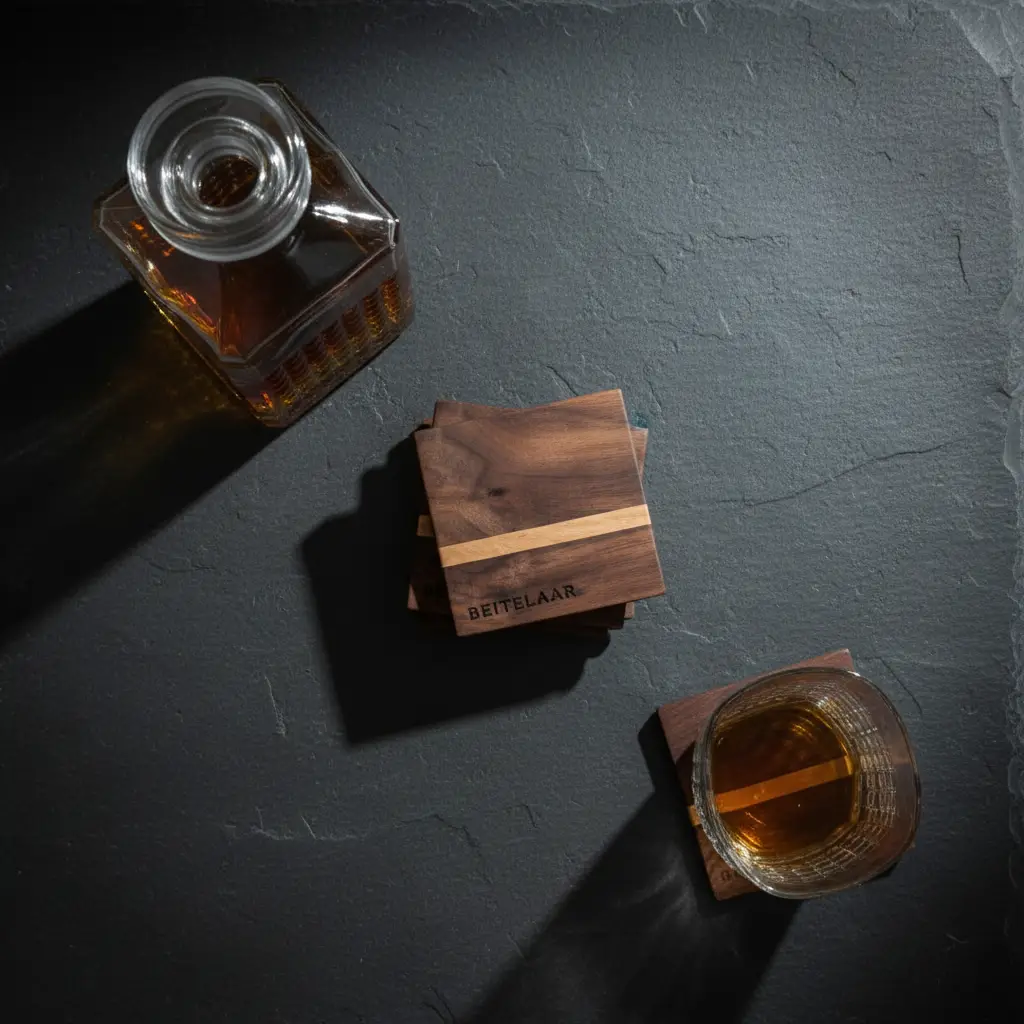 De onderzetters van donkere noot worden gekenmerkt door hun rijke kleur en levendige houttekening. Het donkere hout geeft warmte aan tafel, terwijl de lichte inleg zorgt voor een verfijnd contrast zonder aandacht op te eisen.